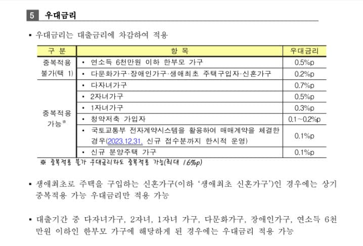 (중복적용 가능 우대금리) 다자녀가구 0.7%p, 2자녀가구 0.5%p, 1자녀가구 0.3%p, 청약저축 가입자 0.1~0.2%p, 부동산 전자계약 우대금리 0.1%p('23.12.31 신규 접수분까지 한시적 운영), 신규 분양주택 가구 0.1%p