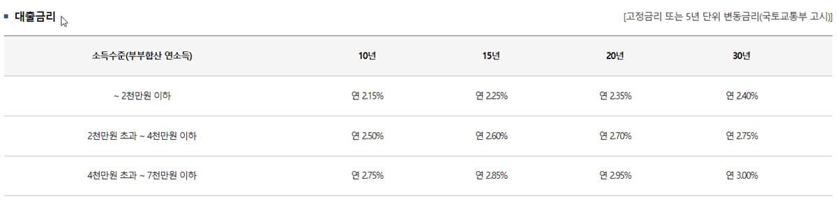 내집마련 디딤돌대출의 금리는 부부합산 연소득과 이용기간에 따라 다르게 책정됩니다. 연소득과 이용기간이 늘어날수록 금리가 높아지는 경향이 있습니다. 금리 한도는 1.85% ~ 2.40%로 책정되어 있으며, 한도는 2억5000만원입니다.
